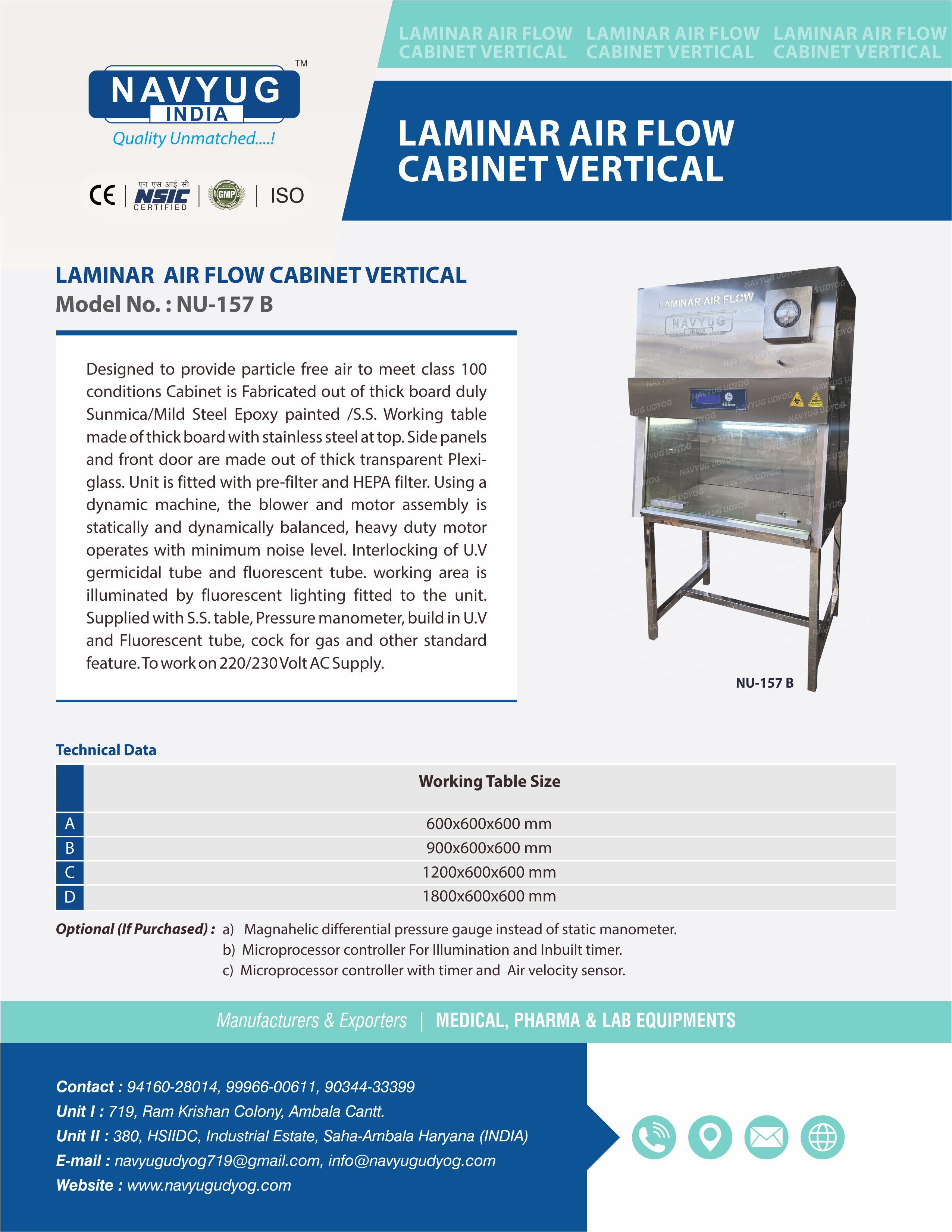 | Optional : a) Magnehelic differential pressure gauge instead of static manometer. b) Microprocessor controller For IIlumination and Inbuilt timer. c) Microprocessor controller with timer and Air velocity sensor. | |