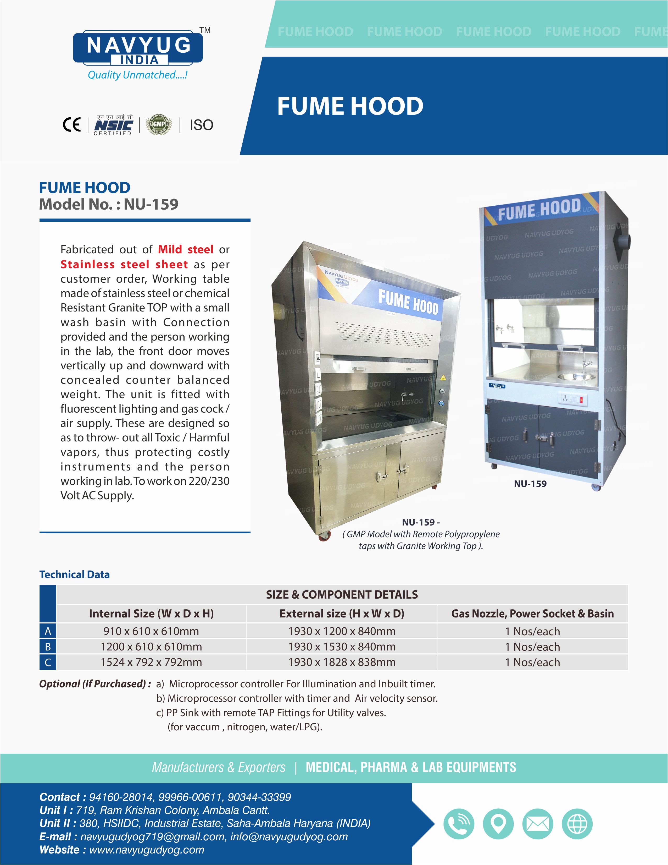 Fabricated out of thick wooden board/mild steel or Stainless steel sheet as per customer order. Working table made of stainless steel and a small wash basin with connection provided and the person working in the lab, the front door moves vertically up and downward with concealed counter balanced weight. The unit is fitted with fluorescent lighting and gas cock/air supply. These are designed so as to throw out all Toxic/Harmful vapors, thus protecting costly instruments and the person working in lab. To work on 220/230 Volt AC 50Hz Supply.